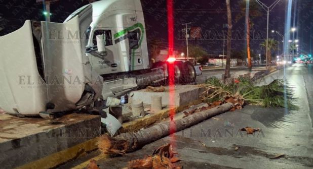 A la altura de la entrada a Plaza Reforma y la embotelladora local, el chofer dijo que una llanta delantera se le trono o poncho, provocando que perdiera el control del volante y fue a treparse al camellón central. En la trepada que se dio, el tráiler se llevó de encuentro una palma de ornato que quedo tirada en los carriles contarios de esa importante avenida.