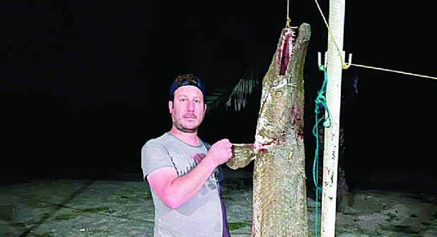 Se logró ponerlo sobre tierra firme tras aplicar mucho esfuerzo para arrastrar unos 65 kilos de puro músculo hasta el árbol más cercano para colgarlo. Mario, totalmente agotado, se sentó a la distancia para observar el metro y 97 centímetros de largo del MONSTRUO NOCTURNO.