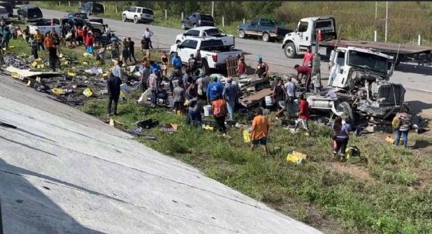 Un tráiler sufrió una volcadura en el Libramiento Sur Dos, en Reynosa, Tamaulipas, y su cargamento de aguacates quedó tirado sobre el pavimento; la rapiña no se hizo esperar y tan sólo en 30 minutos la fruta fue robada.
