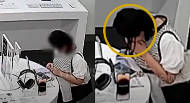 Las imágenes muestra a la implicada mordiendo el cable de seguridad antirrobo al que estaba conectado el celular para así poder liberarlo. La alarma del local se activó, pero los trabajadores no hicieron nada al ver tranquila a la mujer en cuestión, quien se encontraba supuestamente revisando la unidad.