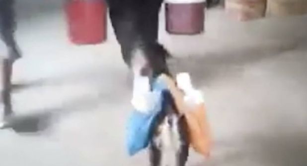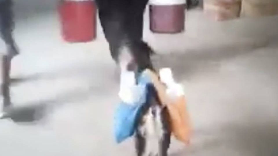 Uno de los clientes, captó al vendedor caminando con sus cubetas de atole, mientras un chivito lo seguía con vasos colgando de su cuerpo.