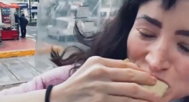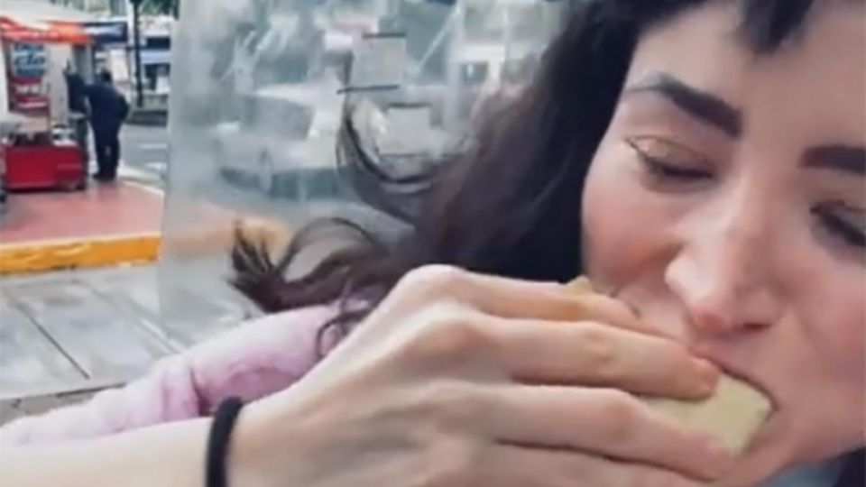 En el clip se ve a la mujer en el puesto ambulante, donde pide dos tacos y se graba mientras los come.